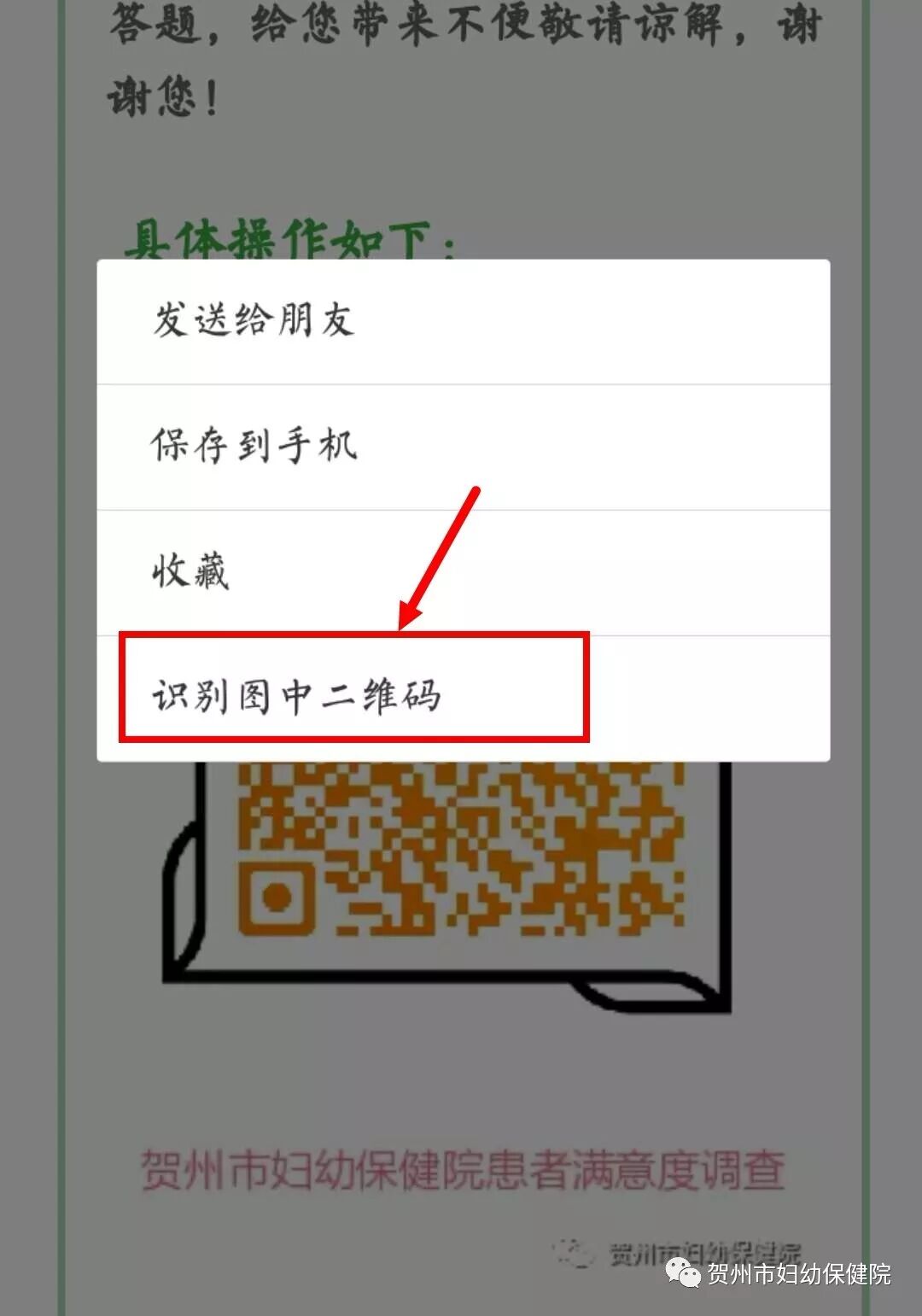 您好!非常感谢您对我院的信任与支持,为了给您提供更优质的医疗服务,占用您几分钟宝贵的时间,敬请您长按以下“贺州市妇幼保健院患者满意度调查”二维码进行答题,给您带来不便,敬请谅解。
