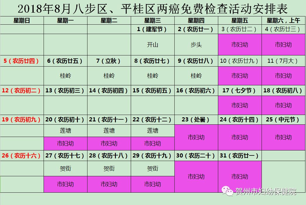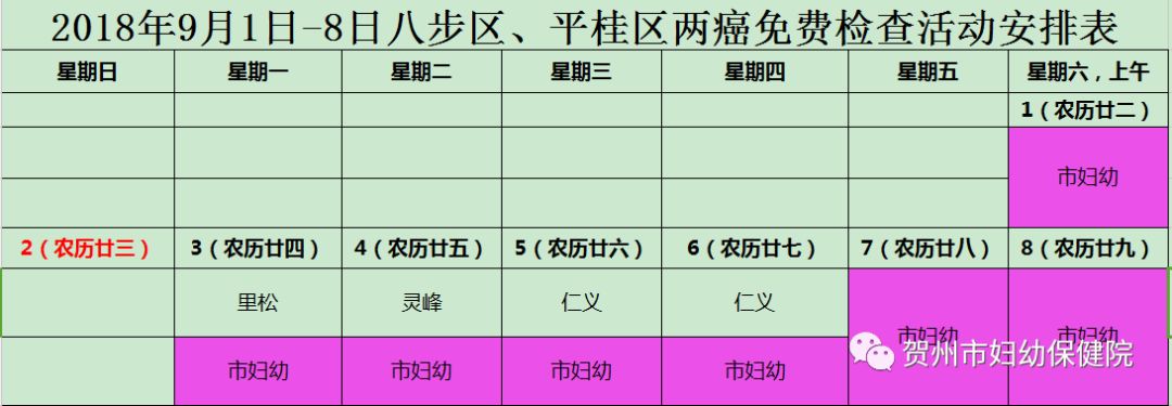 (1)地点1:从2018年8月1日起,在八步区、平桂区各乡镇卫生院均安排有检查点。具体检查时间安排表(2018年8月1日-9月8日),如下: